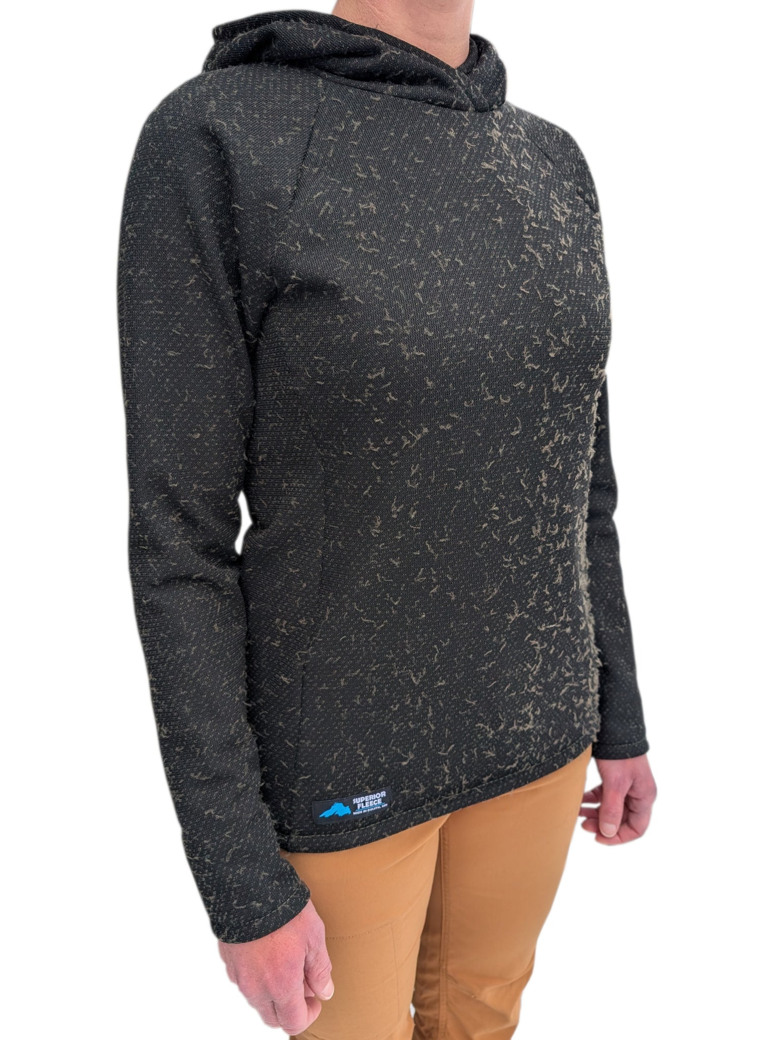 Our Amnicon hoodies are made from Polartec® wool blend fabrics. While most blended fabrics combine polyester and wool within the same thread, Polartec® wool-blends utilizes a bi-component knit that places separate wool and polyester threads where they can be most effective. The result is a wool fabric with a stretchy and durable polyester outer layer and a soft and fuzzy merino wool inner layer. This unique integration of polyester and wool allows us to make a best-of-both-worlds garment that is warm, light, durable, feels great against the skin, and resists odors.